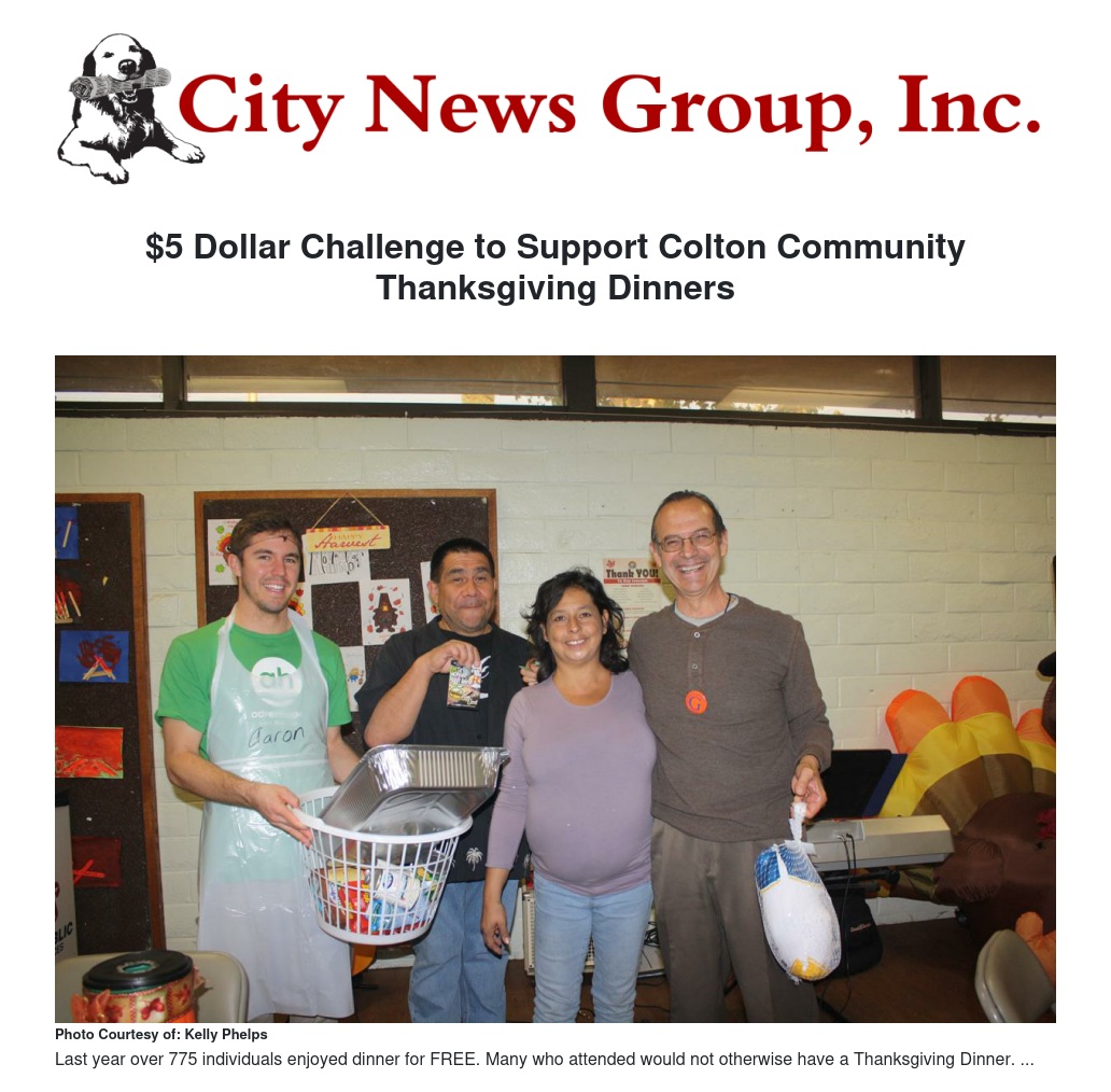 Colton community members are challenged to donate $5 dollar per family member to help support the Community Thanksgiving Dinners. Business and Corporations are invite too!