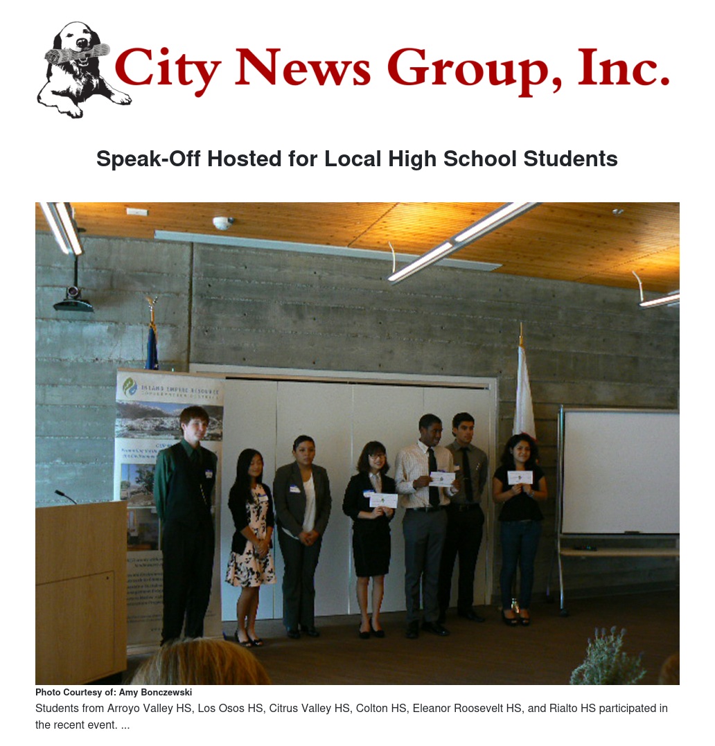 The IERCD is a public agency that provides preservation, restoration, education and outreach services to over 25 cities and unincorporated communities in San Bernardino and Riverside counties. The District operates under the guiding principle that the quality of the environment determines the corresponding quality of life, and works accordingly to improve local habitat sustainability for the benefit of all area dependent species. The Speak-Off is just one of the many events planned and/or participated in by District board and staff, in an effort to spread the message of the importance of conservation of natural resources.