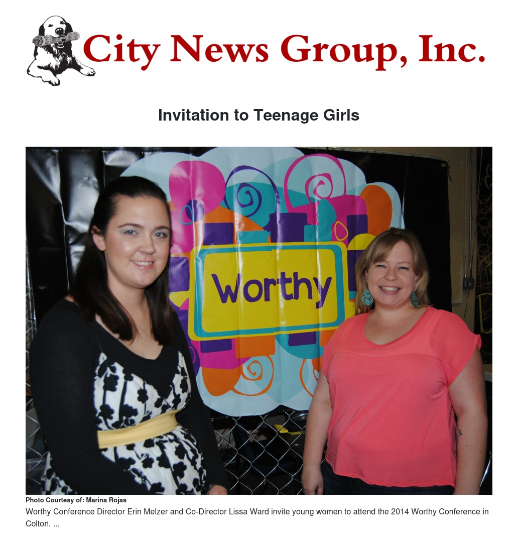 The Worthy Conference costs $25 and is geared for junior high to high school age girls. It will be held March 21 and March 22 at Centerpoint Church at 170 West F Street in Colton. You can find out more information about this conference at www.worthyconference.com or on Facebook.com/WorthyConference.
