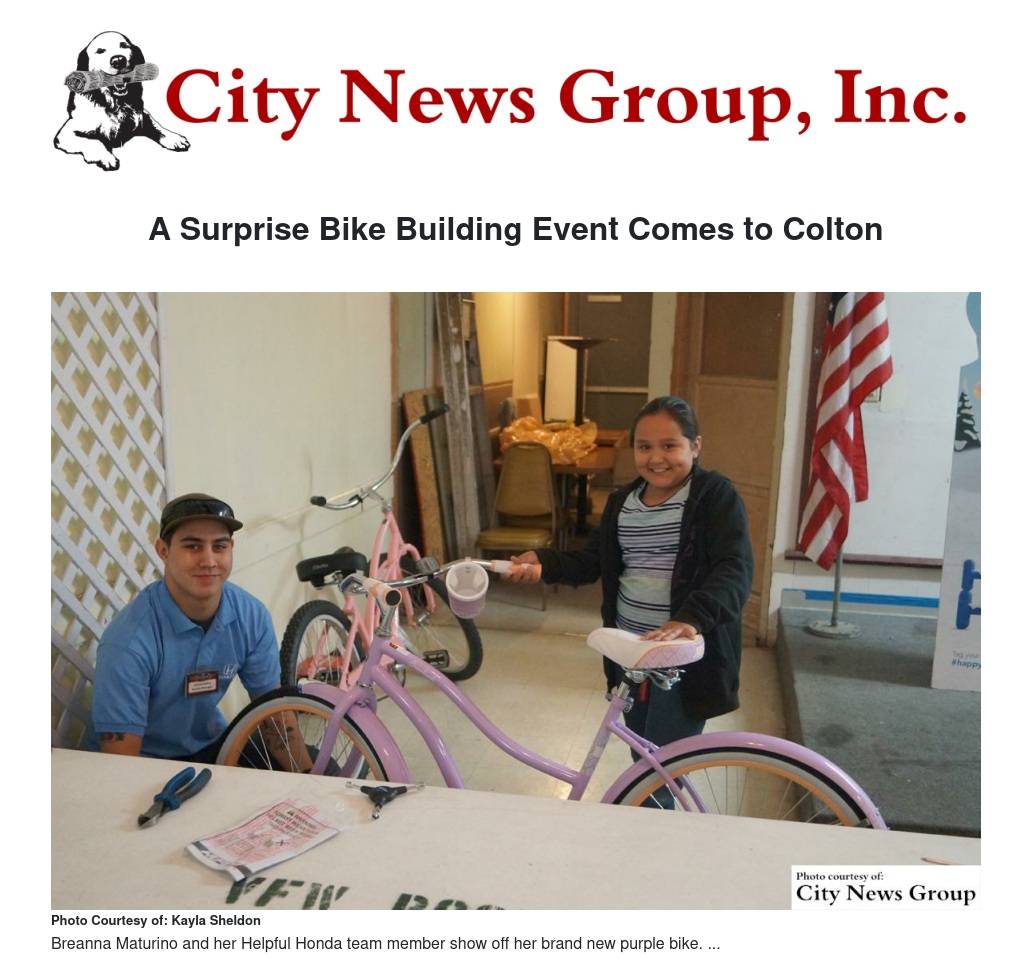 With the instrumental help of the SoCal Honda Dealers Guys in Blue, Seeds of Hope Outreach, and community member Tracylyn Sharrit, 27 children within the Colton area were surprised with their very own bicycle.