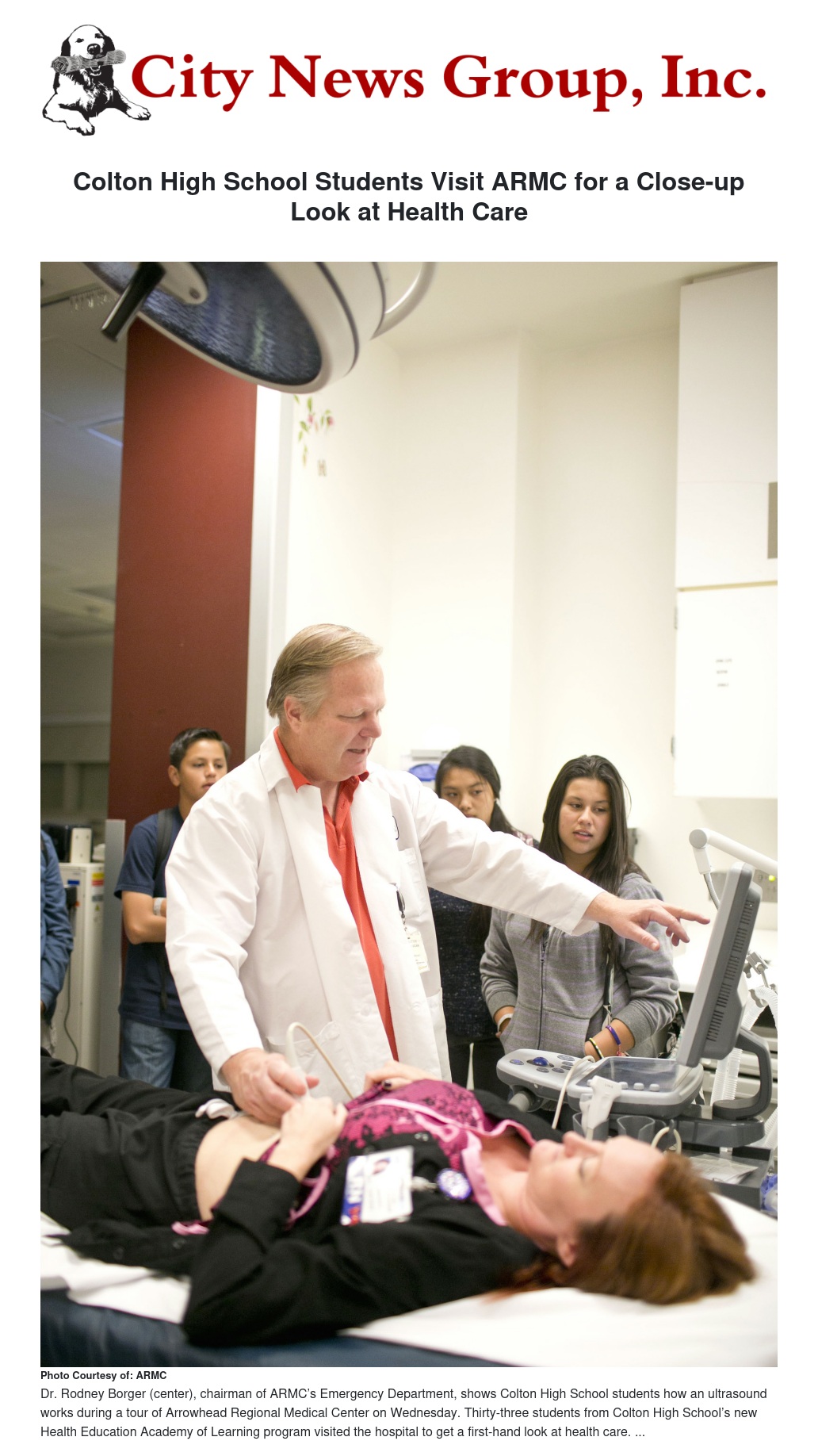 “This visit is a continuation of our partnership with Colton High School and it gives students a chance to get out of their classrooms and see us in action,” said Dr. Rodney Borger, chairman of ARMC’s Emergency Department, who led the students on a tour of the hospital’s emergency room and trauma area. “It benefits the hospital to work with students from the community who are seeking careers in health care, because we can help to shape our future work force.”