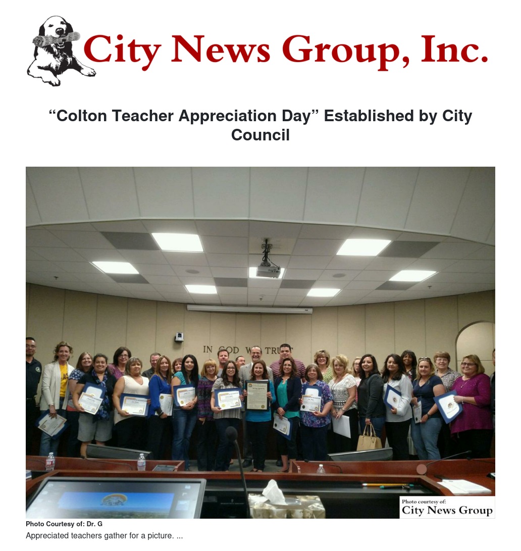 Teachers, families, and special guests were all in attendance while Dr. G read the teachers' names. He also explained that this was the first time the teachers were being formally recognized in the city of Colton, and was very pleased when the City Council decided to establish the first official “Colton Teacher Appreciation Day,” which will be held each year, the third Tuesday of May, starting with May 17, 2016.