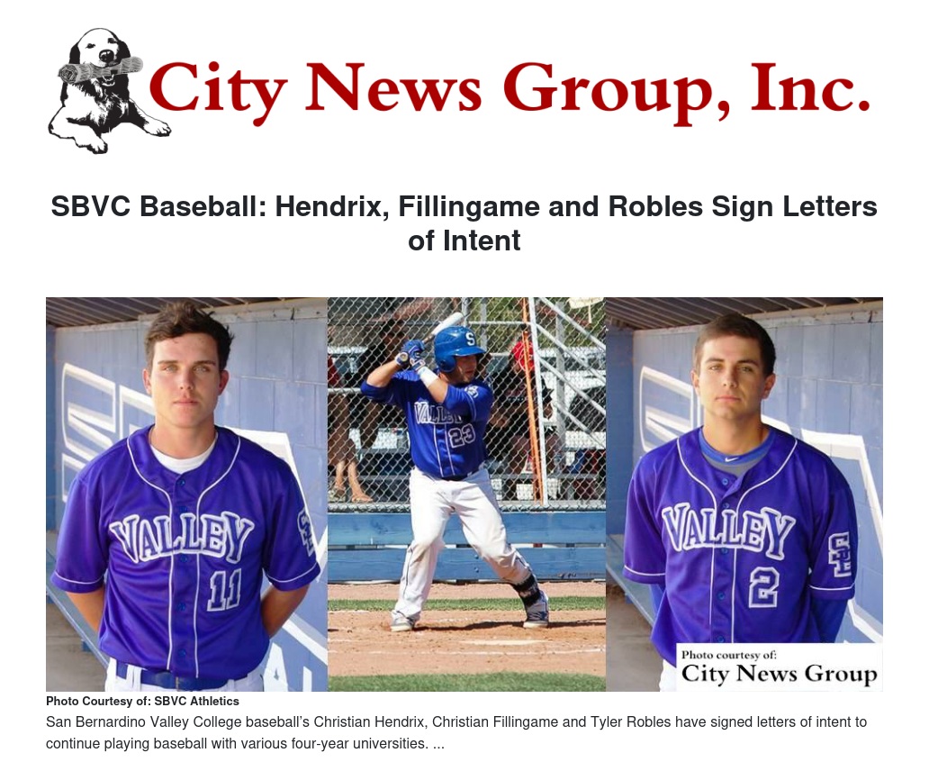 San Bernardino Valley College baseball’s Christian Hendrix, Christian Fillingame and Tyler Robles have all signed a letters of intent. Hendrix with Campbellsville University, Fillingame with Bellevue University and Robles with the University of North Dakota.
