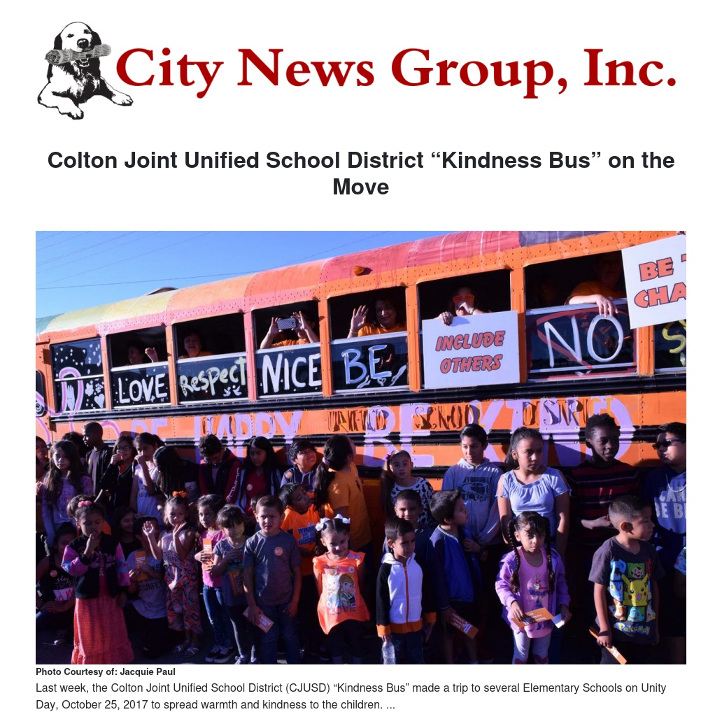 When the bus arrived at each of the elementary schools on Unity Day, the children were so excited seeing how the bus was decorated, and they all wanted to get in it for a ride. The message about not accepting bullying in the schools and community is now resonating through Colton, and the hope is that it will continue for the rest of the school year.