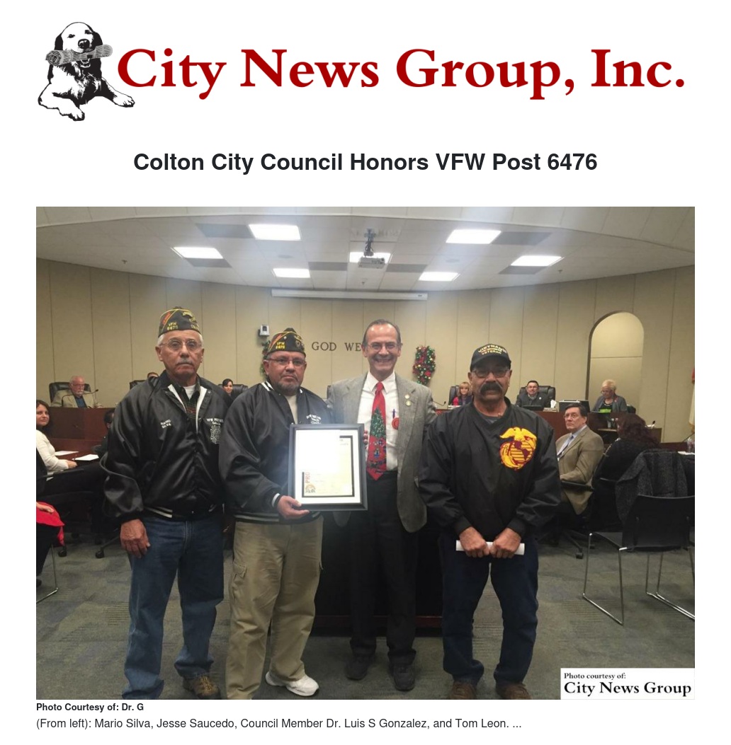 At a recent December meeting of the Colton City Council, Council Member Dr. Luis S. Gonzalez (Dr. G) presented a proclamation to the Veterans of Foreign Wars (VFW) Post 6476, in honor of service to our country.