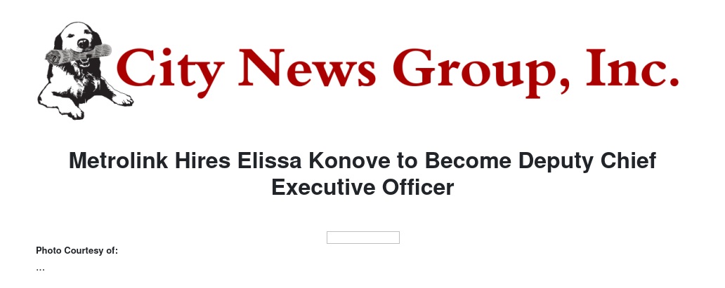 As the agency's deputy CEO, Konove will provide leadership and support on budget, finance, and other Metrolink policies, while achieving the agency's goals and objectives to improve the system for riders. She will also work with external audiences and stakeholders to continue the Metrolink's path in becoming the safest railroad in the nation.