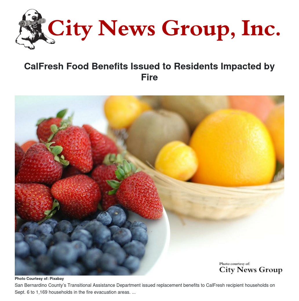 The benefits were made possible by a waiver from the Food and Nutrition Service on Sept. 2. The waiver allowed San Bernardino County’s Transitional Assistance Department to issue replacement benefits to CalFresh recipient households on Sept. 6 to 1,169 households in the fire evacuation areas.