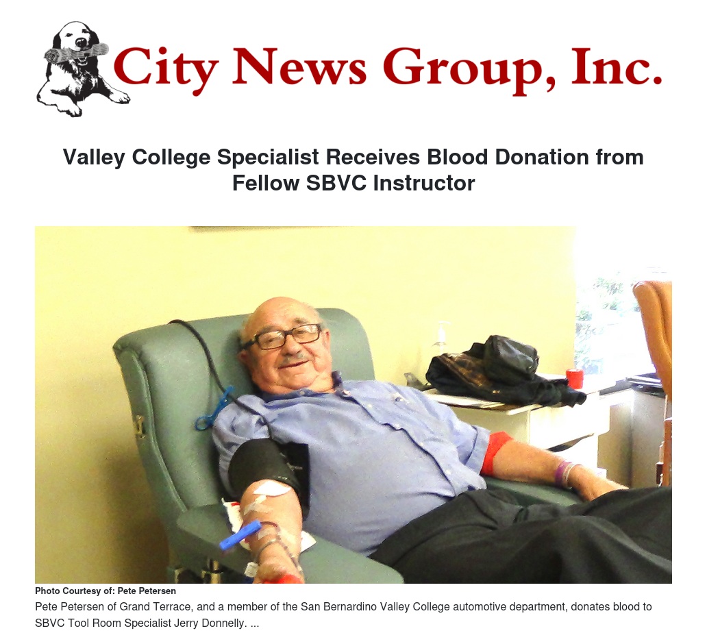 On Nov. 9, Donnelly was rushed back to the hospital, where he was admitted into Intensive Care with internal bleeding. Donnelly needed six additional units of blood, and Grand Terrace resident Pete Petersen, a faculty member with SBVC's automotive department's tech division, gave his second blood donation to Donnelly, and 90th donation overall.