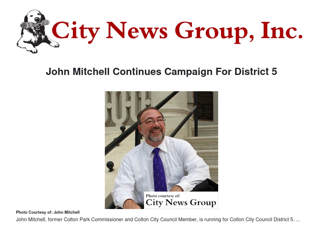 COLTON>> John Mitchell, former Colton Park Commissioner and Colton City Council Member, is continuing his campaigning efforts as he runs for City Council District 5.