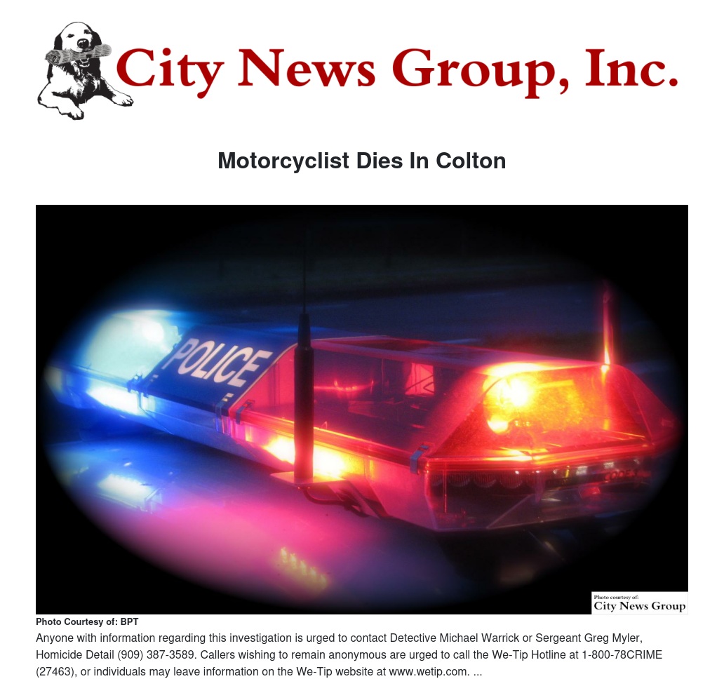 The Colton Police Departments Major Accident Investigation Team (MAIT) is investigating the collision. At this time there is no reason to suspect any drugs or alcohols were involved, however the cause of the collision is still under investigation. The driver’s name is not being released at this time pending notification of next of kin.