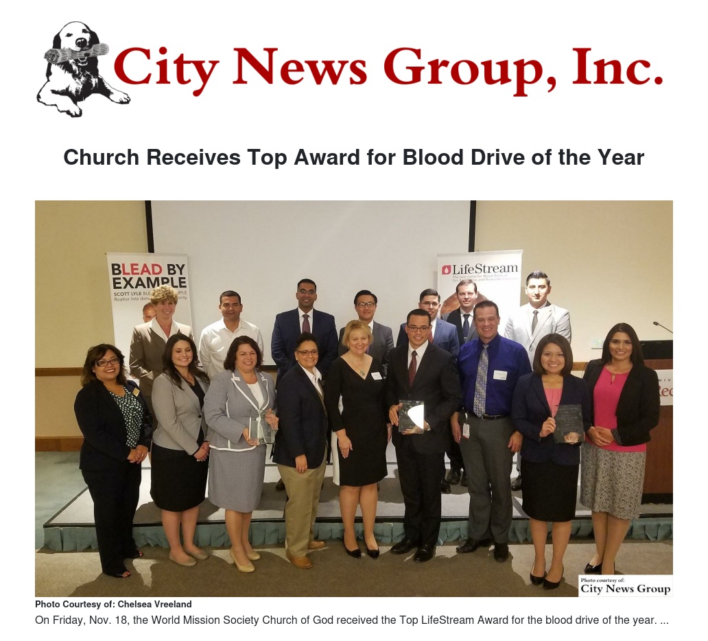 COLTON>> Every two seconds someone in the U.S. needs blood. That is more often than the average person blinks, and although one in four people will require a blood transfusion in their life, less than 10 percent donate blood annually. On Friday, Nov. 18, the World Mission Society Church of God aspired to change these statistics of those and in turn received the Top LifeStream Award for the blood drive of the year.