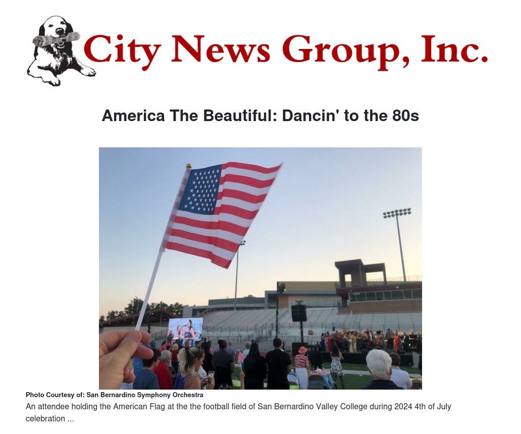 The San Bernardino Symphony Orchestra, under the baton of Maestro Anthony Parnther, will present their annual concert under the stars with fireworks on Saturday, July 5, 2024 at 7:30 p.m. on the football field of San Bernardino Valley College. We hope you can attend, and that you will want to make it possible for local heroes to attend, as well.