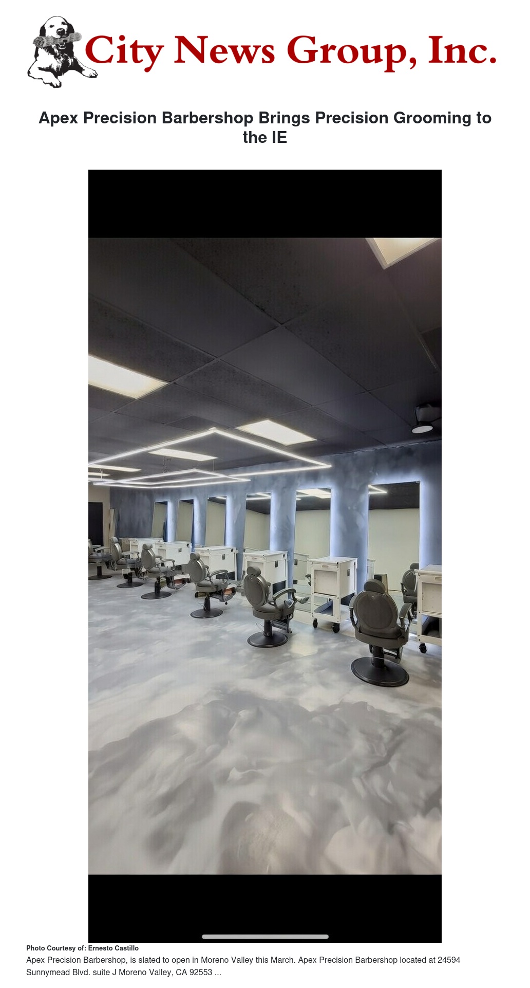 A new barbering destination, Apex Precision Barbershop, is slated to open in Moreno Valley this March. The shop — owned and operated by local barber Ernesto Castillo — will be located off Sunnymead Boulevard and aims to provide premium grooming services to the community.