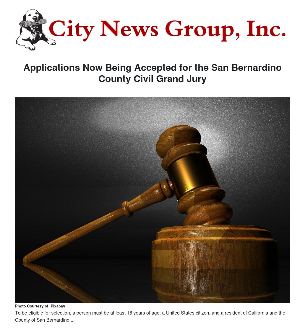 Applications Now Being Accepted for the San Bernardino County Civil Grand Jury by John P. Vander Feer - City News Group, Inc.