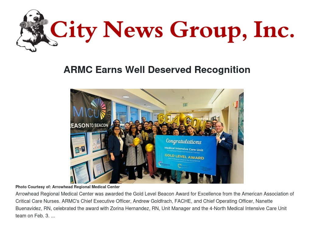 On January 30, 2025, the American Association of Critical Care Nurses (AACN) awarded Arrowhead Regional Medical Center (ARMC) with its Gold Beacon Award for Excellence. The Beacon Award for Excellence — a significant milestone on the path to exceptional patient care and healthy work environments — recognizes unit caregivers who successfully improve patient outcomes and align practices with AACN’s Healthy Work Environment Standards. Units that achieve this award with gold, silver or bronze designations meet national criteria consistent with the American Nurses Credentialing Center (ANCC) Magnet Recognition Program®, the Malcolm Baldrige National Quality Award and the National Quality Healthcare Award.