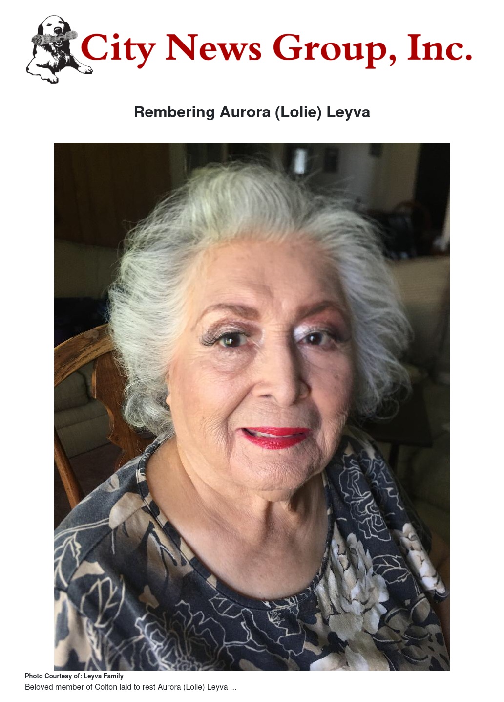 Aurora ( lolie) Ramos Leyva passed away March 27, 2025 in Colton, CA. She was born April, 4 1928.