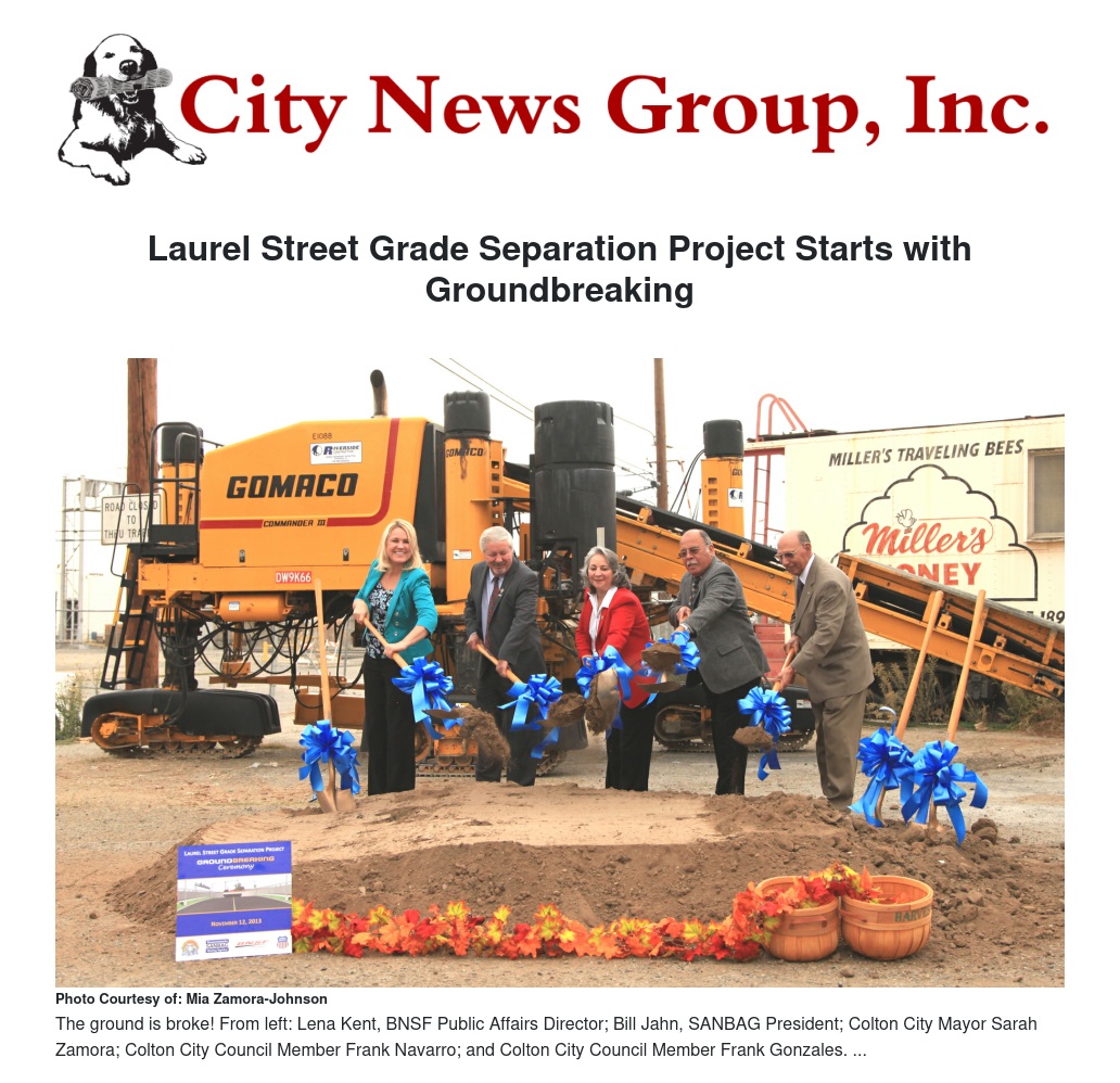 On Nov. 12, officials from SANBAG and the city of Colton broke ground on the project, which will see a bridge constructed above Laurel Street through where trains currently run at the Miller Honey property, 125 E. Laurel St. The project is estimated to take approximately 18 months to complete.