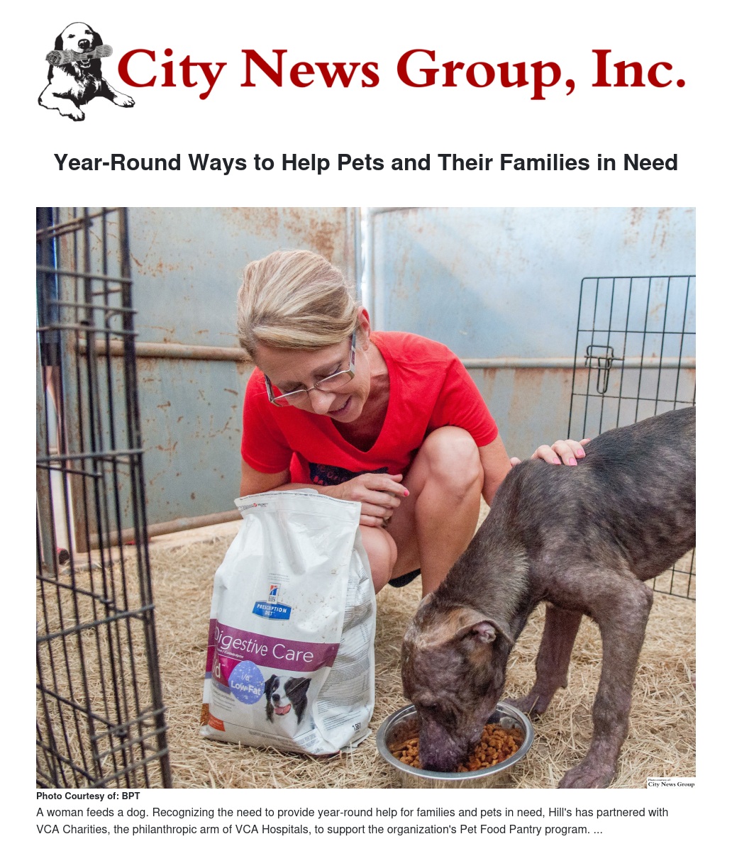 Approximately 48 million Americans face food insecurity every day, according to Feeding America, a non-profit organization and network of more than 200 food banks. That means they, and their pets, face uncertain access to a sufficient amount of affordable, healthy food. "People who face food insecurity should not have to sacrifice the unconditional love and companionship pets bring to their lives," says Joann Fuller, U.S. Shelter Engagement Manager for Hill's Pet Nutrition. "Most food pantries also accept pet food donations. So when you drop off a bag of dog or cat food, you're helping a family in need take care of their best friend." Recognizing the need to provide year-round help for families and pets in need, Hill's has partnered with VCA Charities, the philanthropic arm of VCA Hospitals, to support the organization's Pet Food Pantry program. The program's goal is to provide healthy, nutritious pet food to families that could not otherwise afford it.