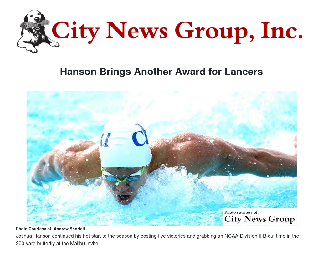 In the Malibu Invite, competing against Division-I schools Pepperdine and Bakersfield, Hanson started with a win and consideration time of one minute, 50.71 seconds in the 200 fly and followed that with a 200-free victory in 1:41.51. He then rattled off victories in the 50 and 100 breast, with respective times of 57.39 and 26.99, and 100 individual medley (51:46) before adding a third-place finish in the 50 fly (22.85).
