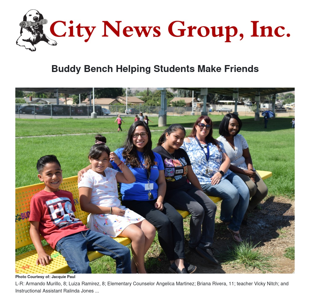 BLOOMINGTON, CA – On a sunny Monday morning, children are playing on the Crestmore Elementary School playground, when a little girl holding a basketball sits down on a big yellow bench. She looks a little sad and lonely, but in just a few minutes, two other little girls cheerily come up to her to ask her to play and soon everyone is all smiles. That’s the magic of Crestmore Elementary School’s new Buddy Bench. Students who might be in need of a friend simply sit down on the bench and other children know to come up and see if they can be that friend.