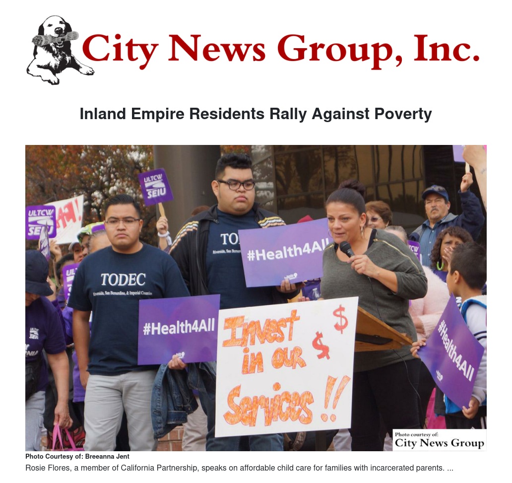 But advocates in San Bernardino shouted for "a fair budget now" and called on Brown to support a state budget that would help seniors, people with disabilities and low-income families out of poverty through restoring the Cost of Living Adjustment to the State Supplemental Payment Program (SSP), passing a Senate bill that would repeal the CalWORKs Maximum Family Grant rule and increasing funding for subsidized childcare.