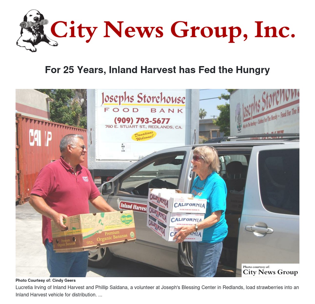 Headed by a group of volunteers, Inland Harvest has worked through the decades to help eradicate hunger at the local level through a two-fold system: volunteers pick up any type of quality, donated food and immediately transport it in personal vehicles to an assigned location for distribution, explained Inland Harvest board member Dr. Cindy Geers.