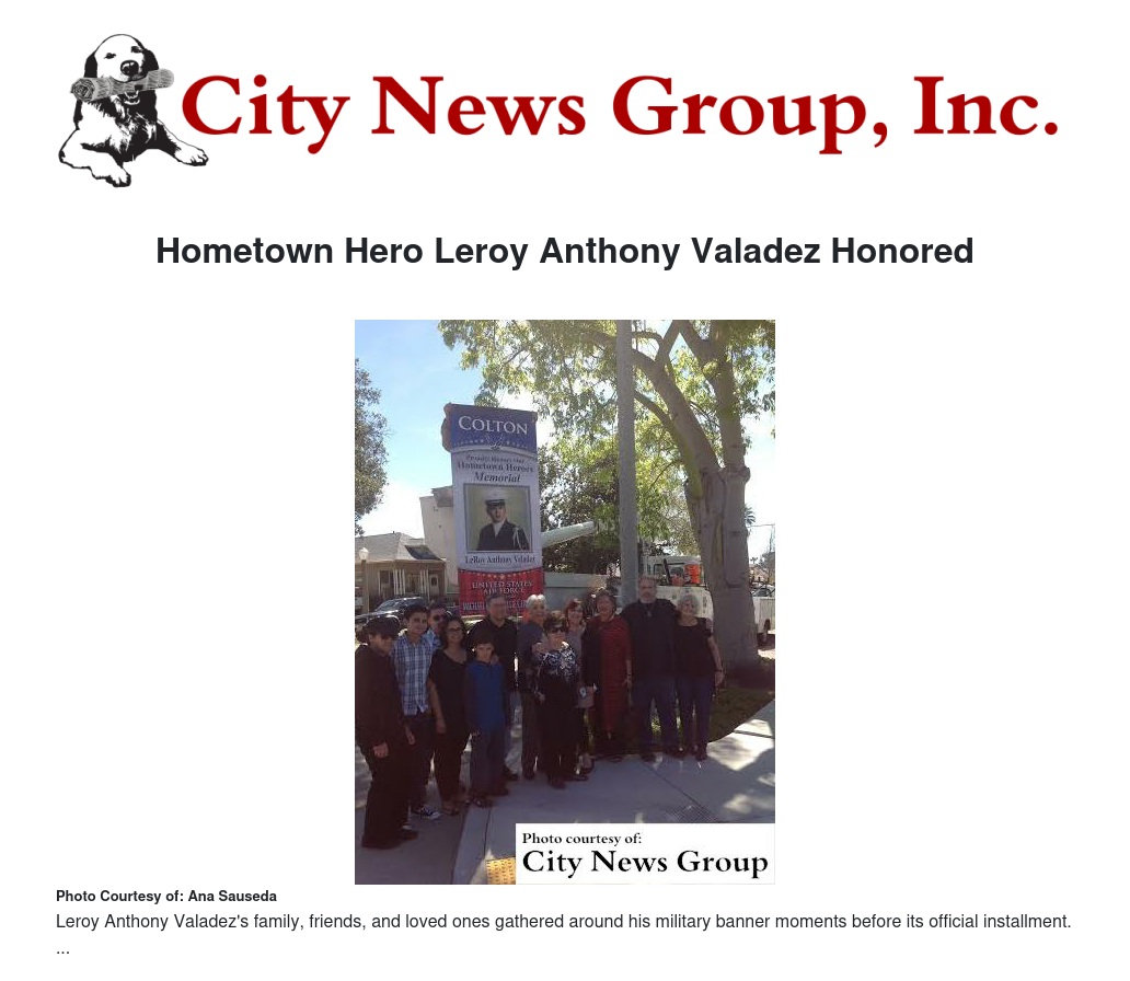 COLTON >> Community members and loved ones of Leroy Anthony Valadez, who was born on Feb. 13, 1946 and passed on Aug. 31, 2007, recently gathered at the corner of La Cadena Dr. and "B" St. to honor their loved one through a Hometown Heroes Memorial ceremonial banner installation. Among those in attendance were his mother, Elizabeth; widow, Anne; sister, Joanna; son, Leroy Anthony II; daughter, Leticia; brother, Nick, and other family neighbors, friends, and colleagues.