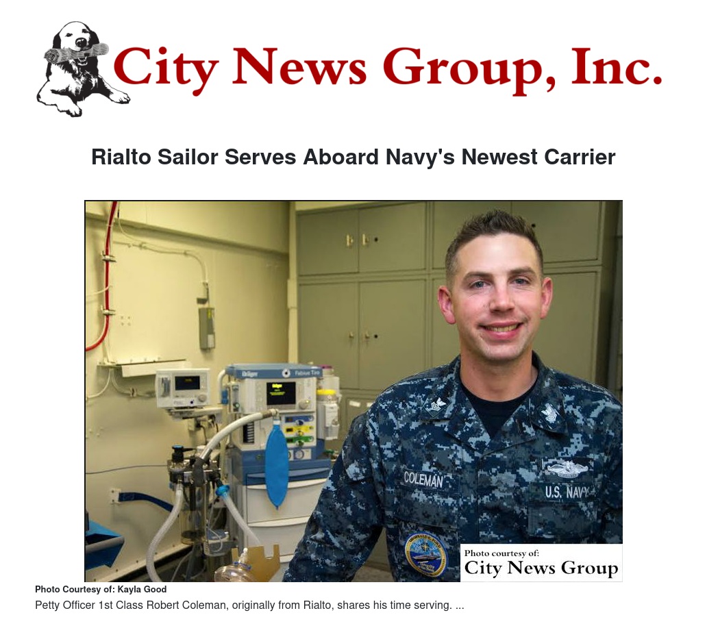 A 2002 Eisenhower High School graduate and Rialto native is serving in the U.S. Navy aboard the aircraft carrier, PCU Gerald R. Ford (CVN 78).