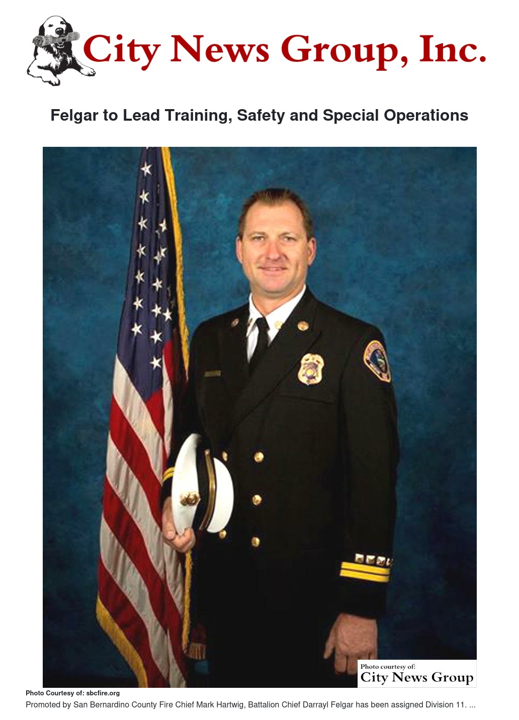 San Bernardino County Fire Chief Mark Hartwig is honored to announce the promotion of Battalion Chief Darrayl Felgar to Division Chief, assigned to Division 11 (Training, Safety & Special Operations).