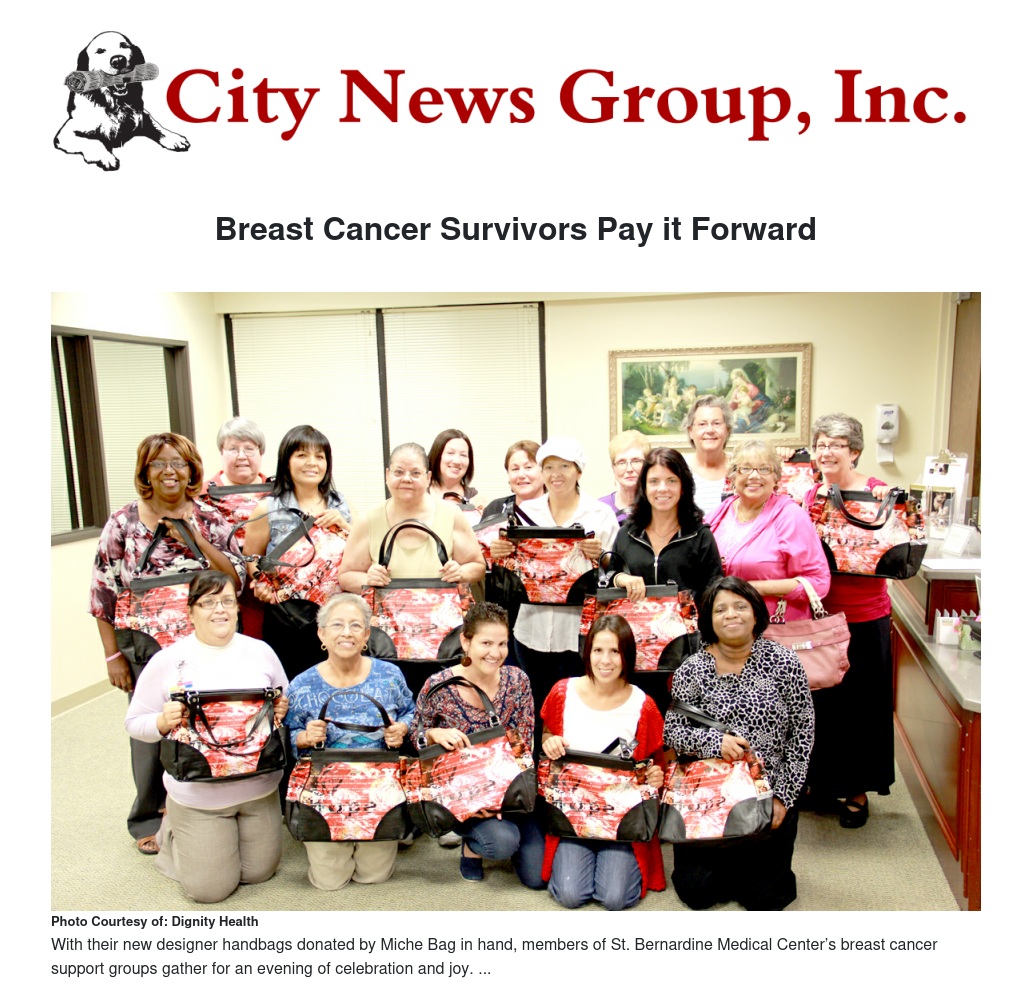Women from Dignity Health St. Bernardine Medical Center's monthly breast cancer support groups, Breast Cancer Survivor Group and Esperanza Para Mujeres in October received a gift of handbags, valued at $75 each, from Miche Bag, a designer handbag company that donates a portion of proceeds from the sale of their "Hope" shell to cancer research. Presented by Jill Damato, a regional Miche Bag representative and a frequent vendor at St. Bernardine's annual Holiday Boutique, the bags were well-received by the survivors. After receiving their gifts, the women wanted to "pay it forward" and do something for other breast cancer patients.