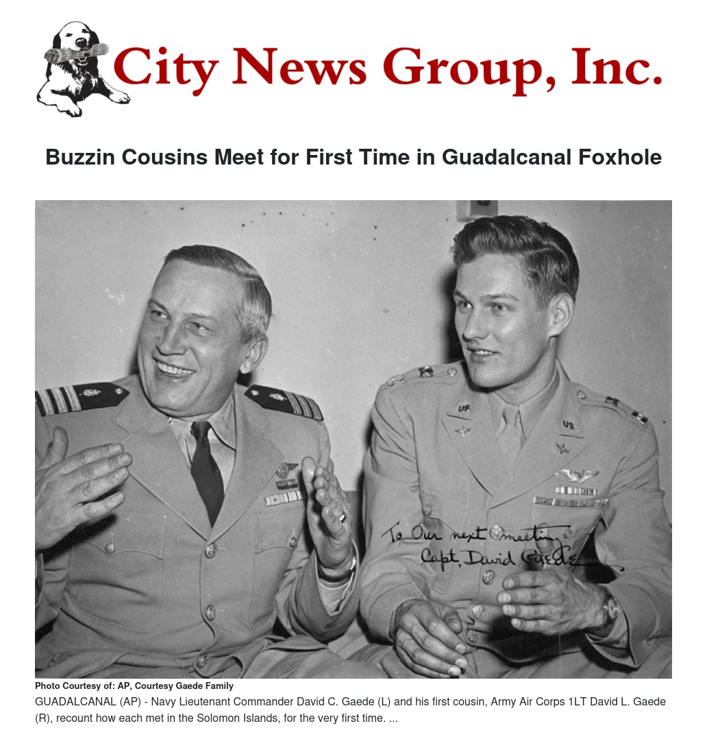 GUADALCANAL, SOLOMON ISLANDS, OCT- 4TH, 1942. (AP) – When the air raid siren sounded, Lieutenant David L. Gaede of Columbus, Ohio, dived into a foxhole. The aviator landed smack on top of a navy officer who already taken shelter there. “Sorry," grinned the first man. “My name is David L. Gaede.” The second officer grinned and stuck out his hand. “So is mine. I am Lieutenant Commander David C. Gaede of Coronado, California.” The men were first cousins, but had never met before.