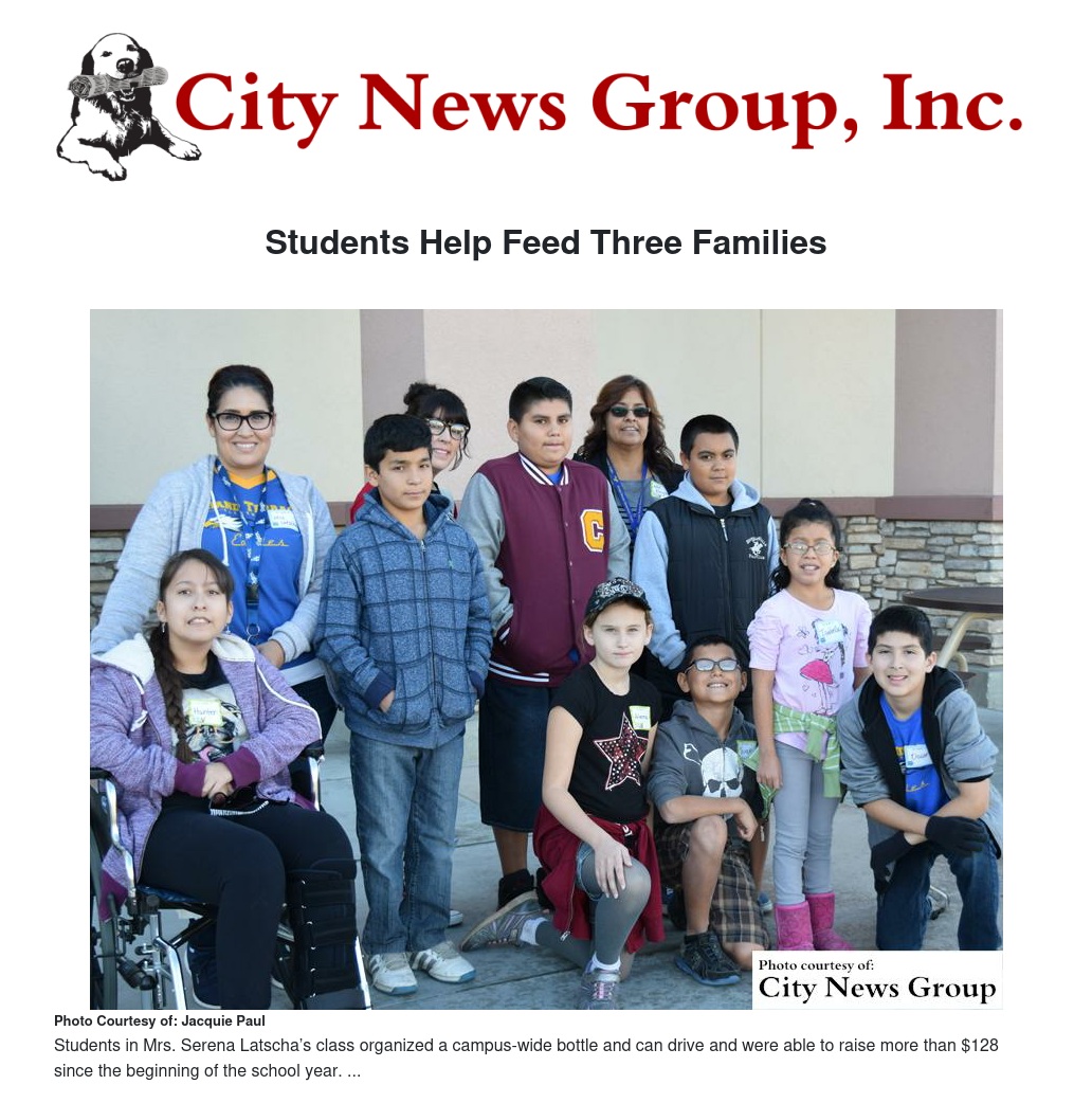Students in Mrs. Serena Latscha’s class organized a campus-wide bottle and can drive and were able to raise more than $128 since the beginning of the school year. Combined with a donation from their teacher, it was enough to buy Thanksgiving groceries for three Grand Terrace Elementary School families in need.