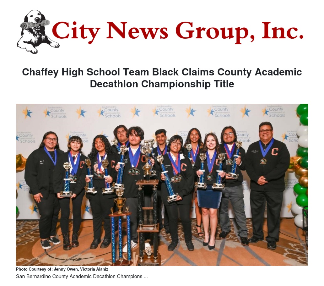 Chaffey High School, of Chaffey Joint Union High School District, will send its top nine scoring decathletes and coach to represent San Bernardino County at the California Academic Decathlon State Competition in Santa Clara from March 22-24.