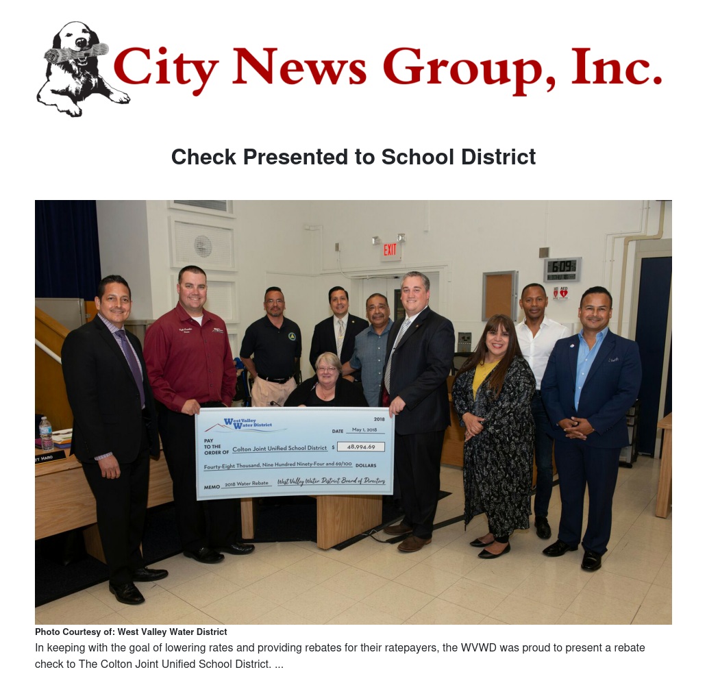 West Valley Water District (WVWD) presented the Colton Unified School District with a $48,994.69 check at the June 7, 2018 board meeting. Vice President Greg Young and Board Member Kyle Crowther made the presentation to the school board on behalf of West Valley.