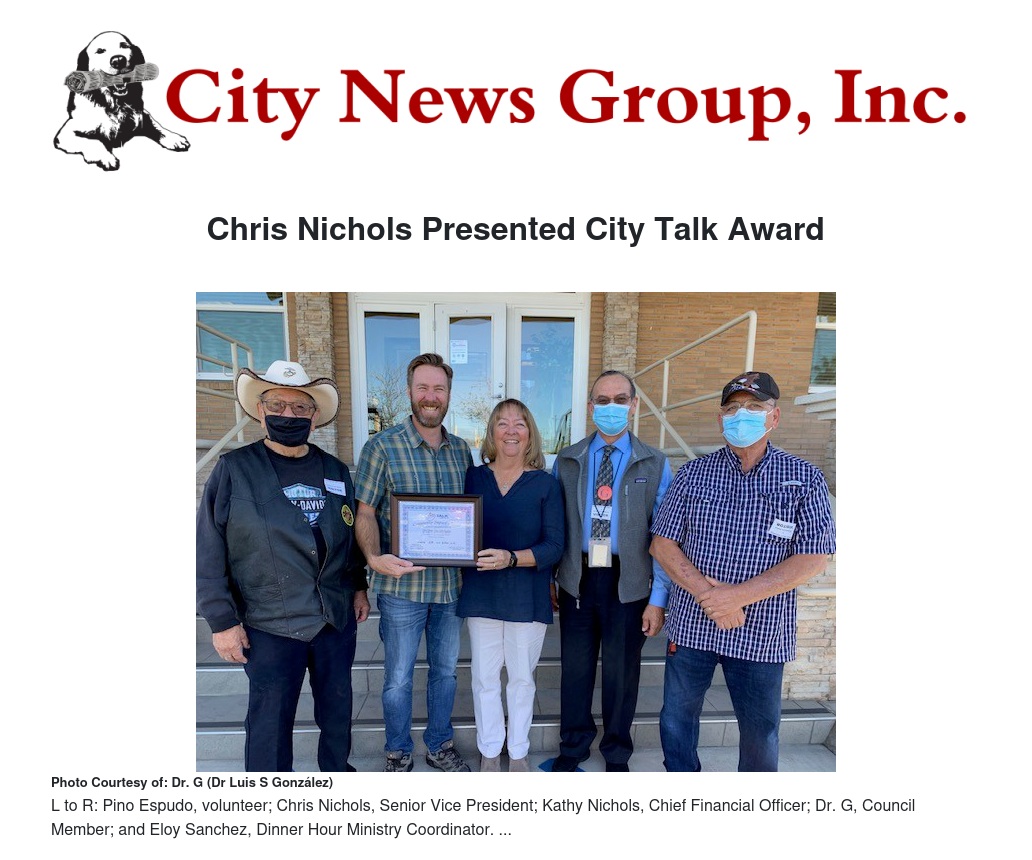 The focus of the visit was to present Chris Nichols with the CITY TALK “Community Impact Award” for the many years of support he has given to the Dinner Hour Ministry. According to Eloy, the support from Chino Valley Ranchers has included, “Monthly donations of egg pallets for the food distribution program, as well as financial support in helping to provide toys for children in need at Christmas time.” As Eloy explains, "This support has really been a blessing over the years… Seven years."