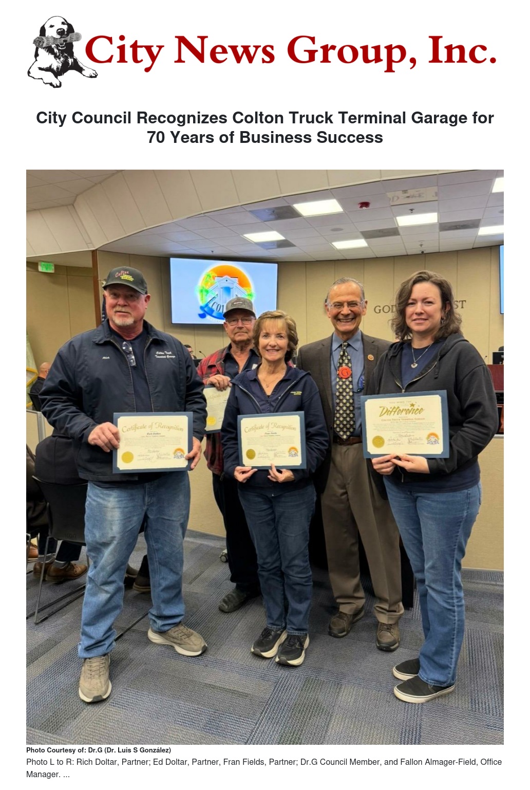 City Council Recognizes Colton Truck Terminal Garage for 70 Years of Business Success by Dr.G (Dr. Luis S González) - City News Group, Inc.