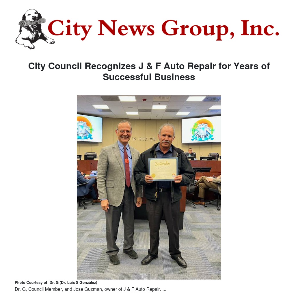 Mr. Jose Guzman is to be congratulated not only for his successful business in Colton but for his long and successful career as an auto mechanic. He has survived the pandemic and has made meaningful efforts in providing input to the city for improvements in the area. We truly hope that he will continue his successful business for as long as possible, but with retirement on the horizon, we also want to wish him well in his future endeavors. The Council also recognizes him for his service to our residents, and for making a valuable contribution to our local economy.