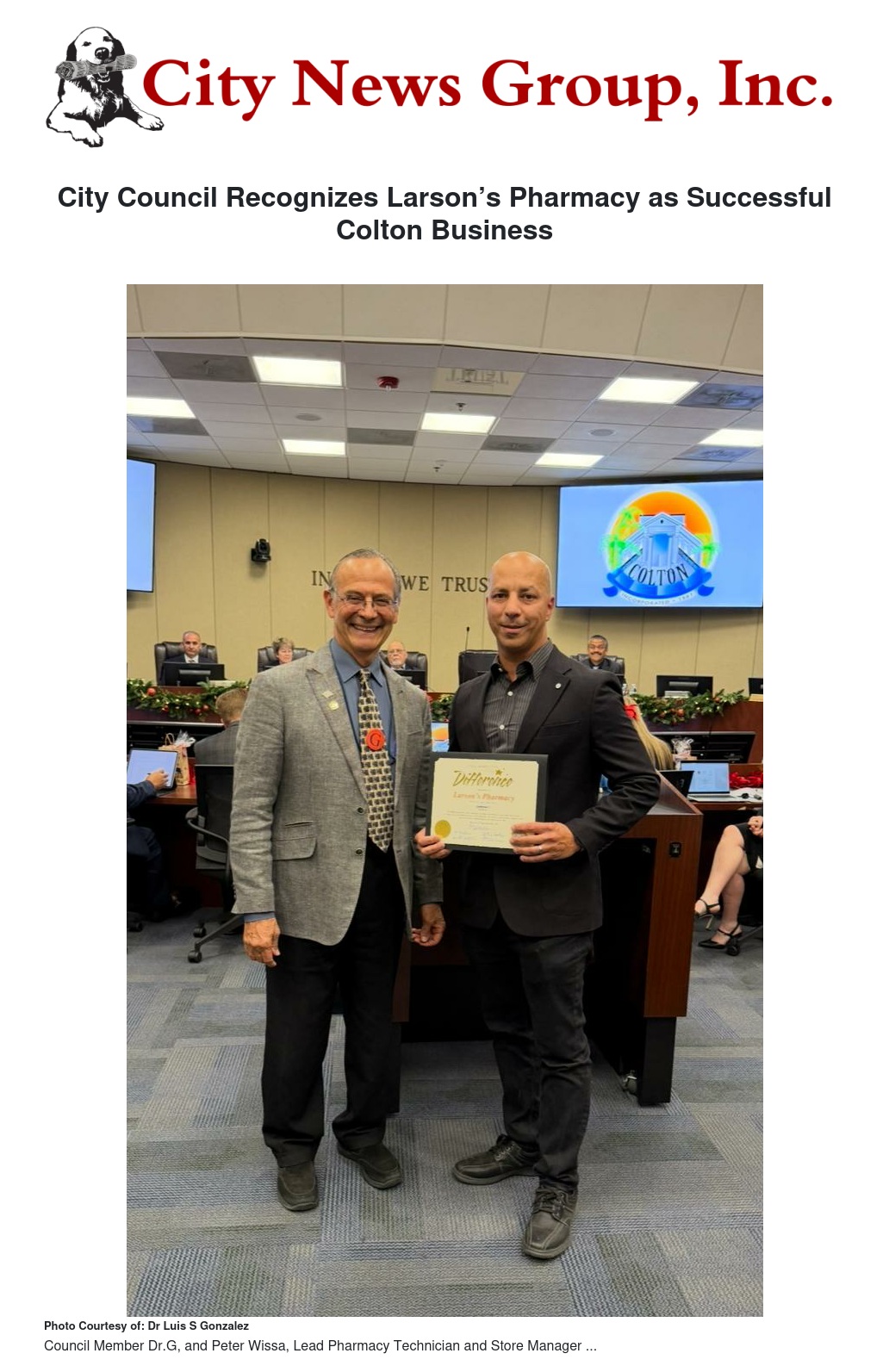 At the recent Council Meeting Dec 17, Council Member Dr.G (Dr. Luis S. González) presented Mr Peter Wissa, of Larson’s Pharmacy, with a “Business Focus” Recognition Award for their successful business operation in the City of Colton. This long-established company originally started in 1957 and has been a mainstay of the Colton downtown business community for 67 years. Mr. Wissa, Lead Pharmacy Technician and Store Manager, has been working side by side for 19 years with the current owner, Mr. Ed Botros, who purchased Larson’s Pharmacy in 2005.