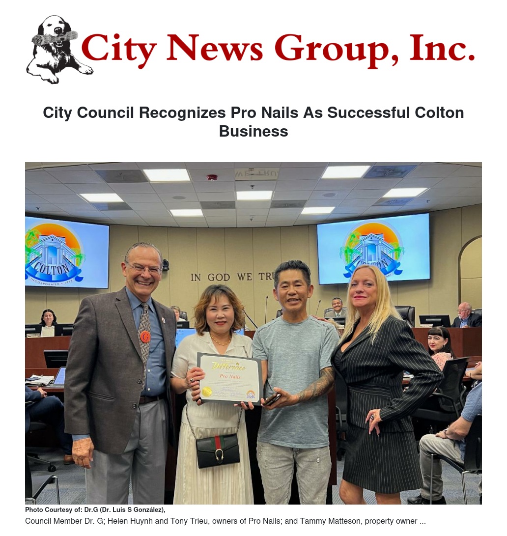 At the recent Council Meeting July 16, Council Member Dr.G (Dr. Luis S. González) presented Tony Trieu and Helen Huynh , owners of Pro Nails, with a “Business Focus” Recognition Award for their successful business operation in the City of Colton. This long-established company opened in 2004, and has been a mainstay of the Colton business community for 20 years.