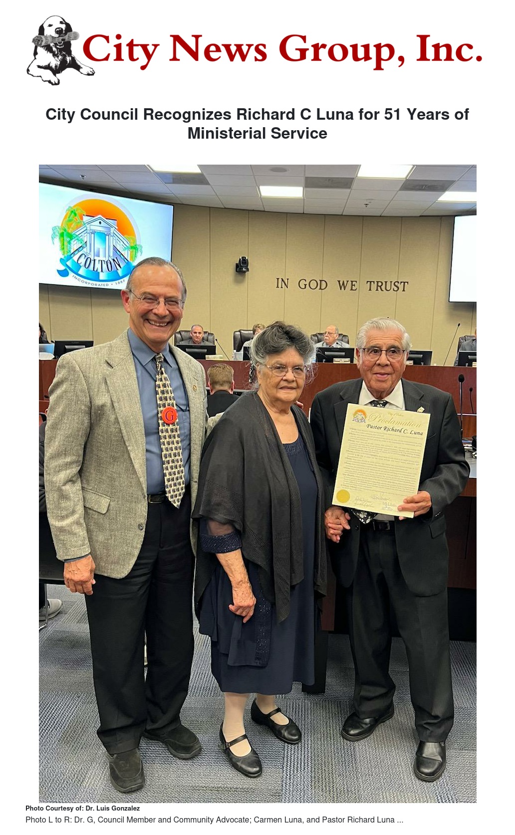 At the recent Clton City Council Meeting April 2, Council Member Dr. G (Dr. Luis S. González) presented a proclamation to Pastor Richard C. Luna, in recognition of his long-standing service to the members of Amazing Grace Apostolic Church, the neighborhood in and around L Street, and to the community of Colton.