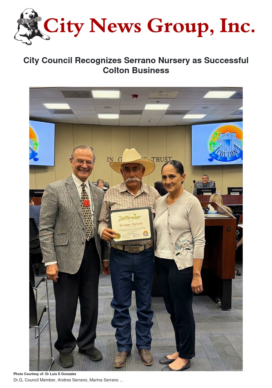 Andres and Marina Serrano are to be congratulated for their tremendous effort in establishing Serrano Nursery as a successful business in Colton. We truly hope that they will continue their successful business for years to come, and we want to recognize them for providing a wonderful convenience to our residents, and making a valuable contribution to our local economy.