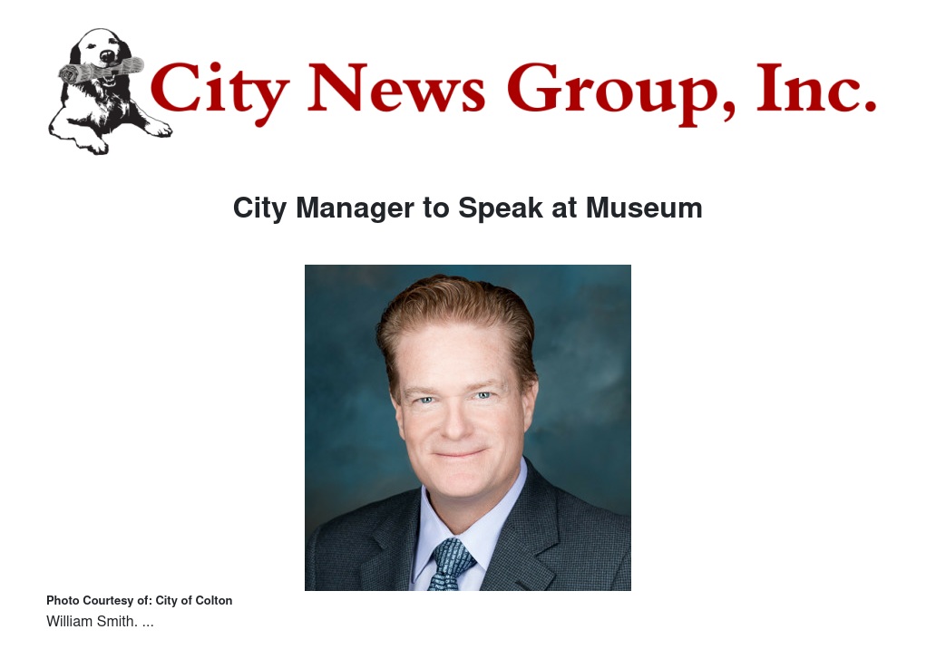 On Saturday, June 8, at 2:30pm, in the downstairs research center, the Colton Area Museum’s (CAM) guest speaker program will feature Mr. Bill Smith, City Manager of the City of Colton, and former Director of Community Services Department.