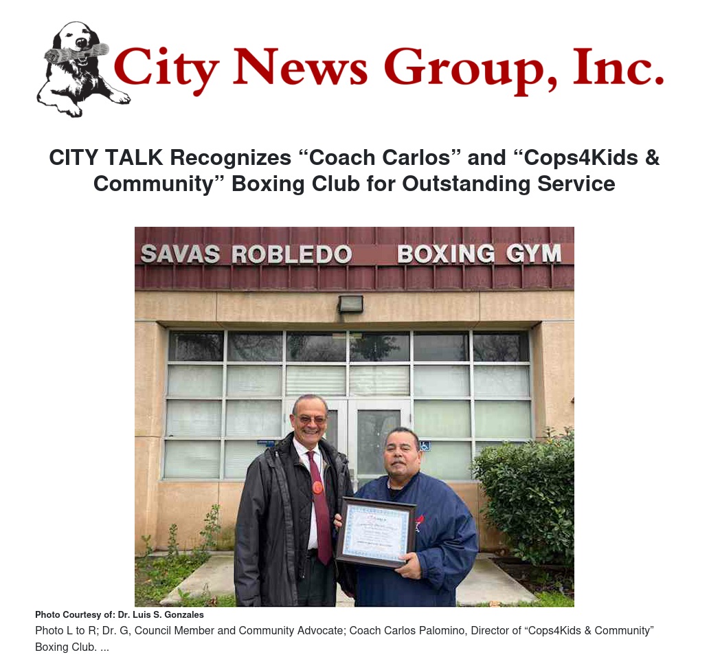 On Wednesday, January 24, Council Member Dr. G (Dr. Luis S Gonzalez) presented the CITY TALK “Community Impact” recognition award to “Coach” Carlos Palomino, Director of the “Cops4Kids & Community” boxing program for Colton youth.