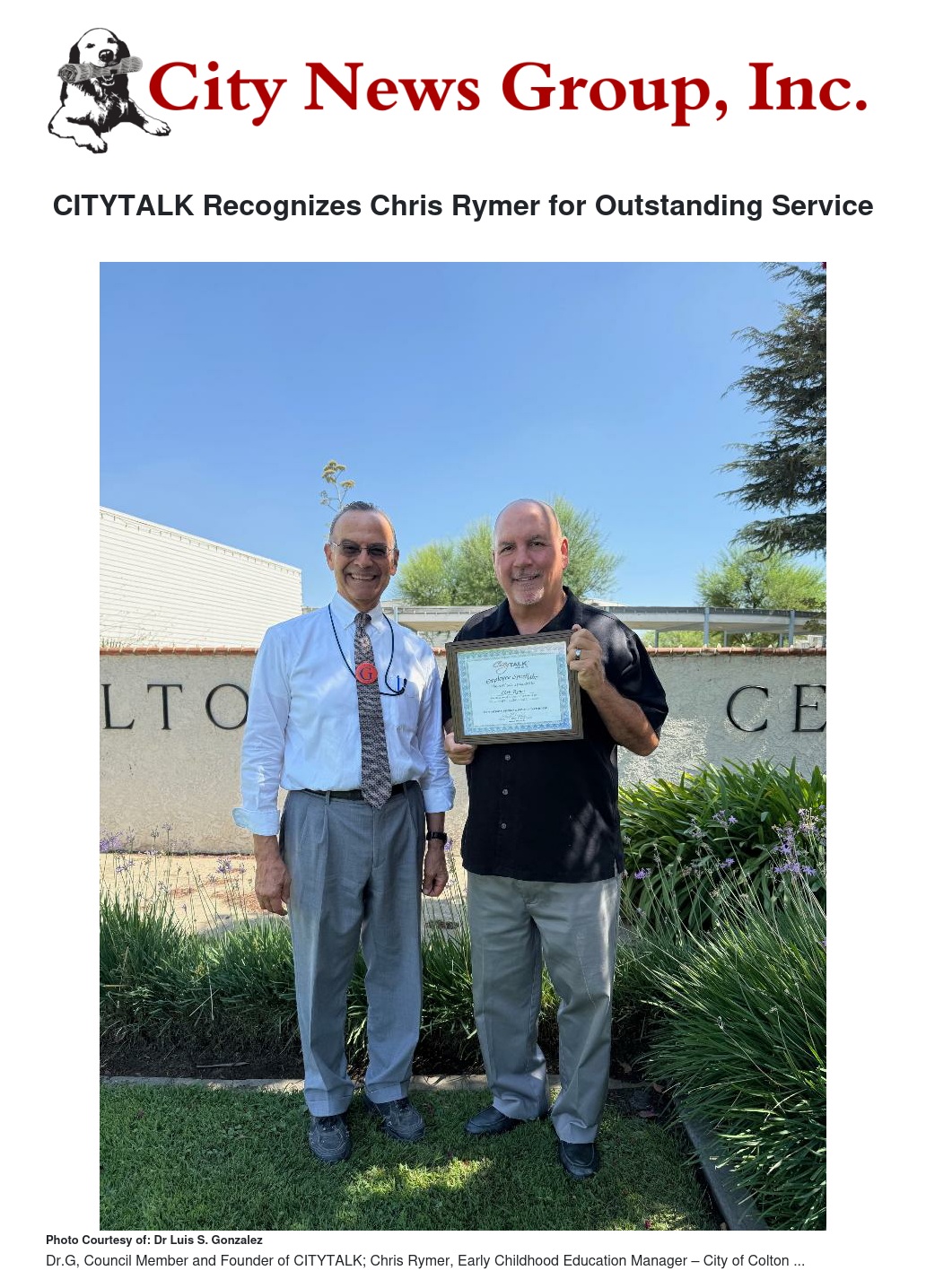 On Thursday, September 11, Council Member Dr.G (Dr Luis S González) presented the CITYTALK “Employee Spotlight” award to recognize Chris Rymer, a 19-year employee of the City of Colton Community Services Department. Mr. Chris leads the Early Childhood Education Program which is made up of two component parts, the School Age Program (SAP) and the Pre-School Program (CSPP).