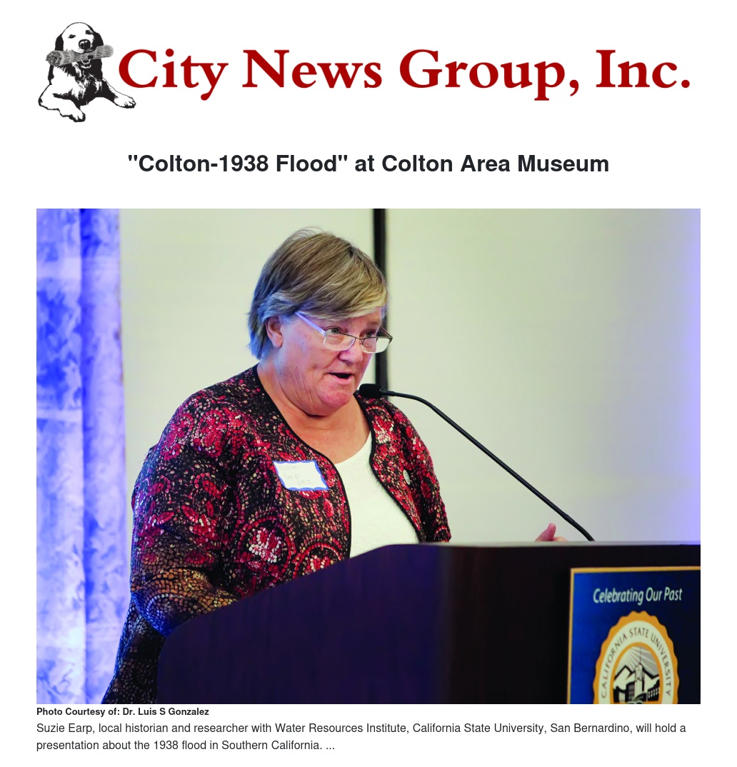 Her talk, which will include background information about local demographics and a brief history of floods in San Bernardino, emphasizes the human and social side of natural disasters: experiences and consequences. Suzie Earp will share stories and images of the great 1938 flood in southern California. Earp has more than 150 pictures of the flood itself along with an extraordinary 1938 home movie.