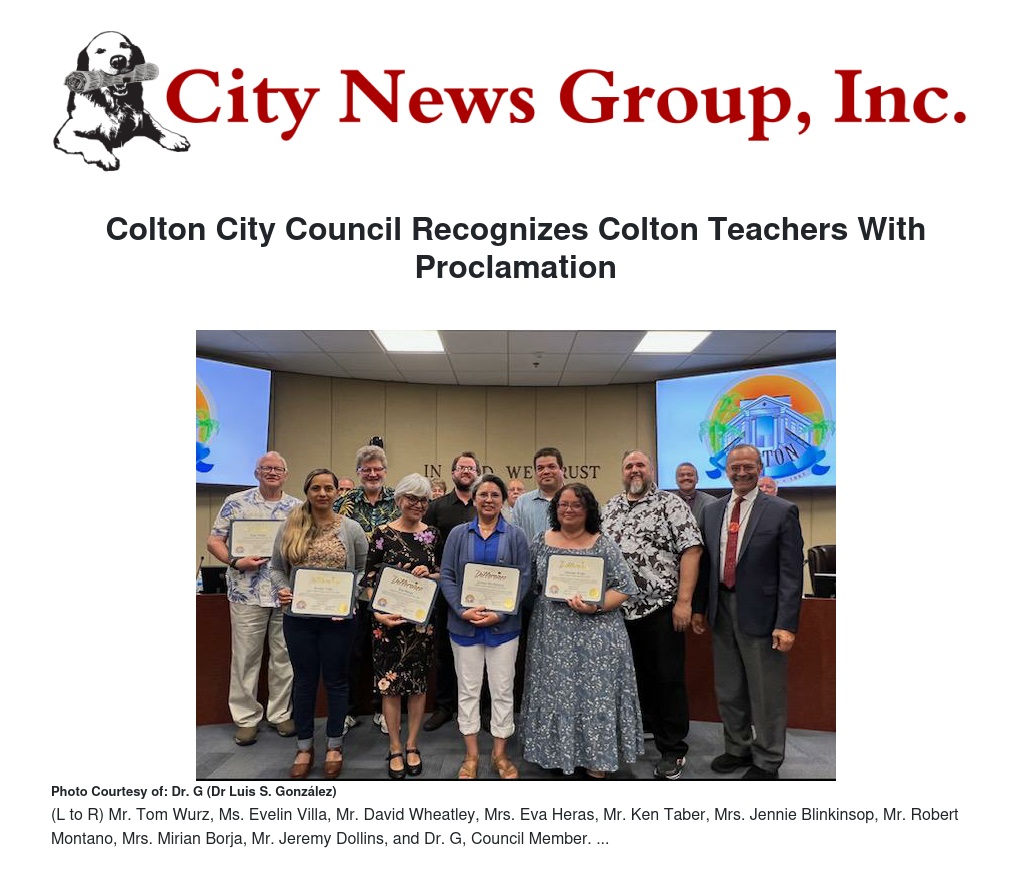 With this formal presentation, the City Council recognizes the commitment our teachers make to educating our Colton students. Teachers also make a positive contribution to the lives of their students and leave a lasting impression. Each and every day, through dedication and hard work, teachers provide the inspiration to help our students succeed.