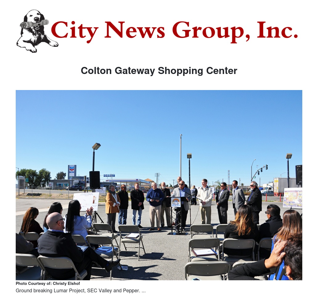 Mayor Frank Navarro welcomed Supervisor Josie Gonzales and a crowd of nearly 50 Council Members, Commissioners, City staff and citizens to the groundbreaking of another retail center in Colton. The Colton Gateway Shopping Center will be located at the southeast corner of Valley Boulevard and Pepper Avenue in Colton. Developers Scott Fawcett of the Marinita Development Group and Michael Lundin of Canaan Pacific Development Group are partnering to develop the site.