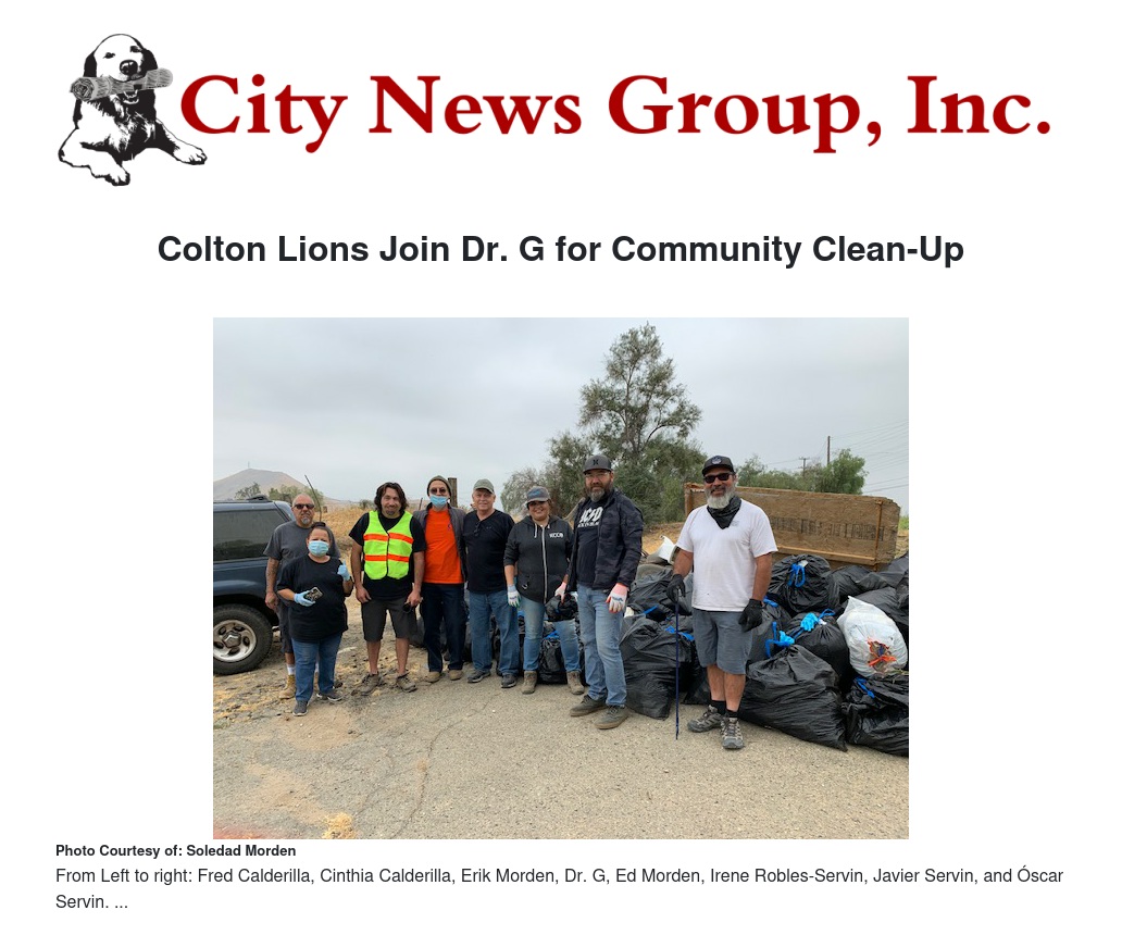 Any time individuals or groups offer to volunteer, the efforts are well-received by the general public, and those that participate fulfill a personal sense of local pride and contribution to our community. One of the members, Evelyn Lopez, posted on FB, “Our Lion’s Club is going to continue to help.” Other members of the Colton Lions Club who helped last weekend for the clean-up project were Cynthia Calderilla, Fred Calderilla, Edward Morden, Erik Morden, Soledad Morden, Irene Robles, Javier Serven and Oscar Serven.