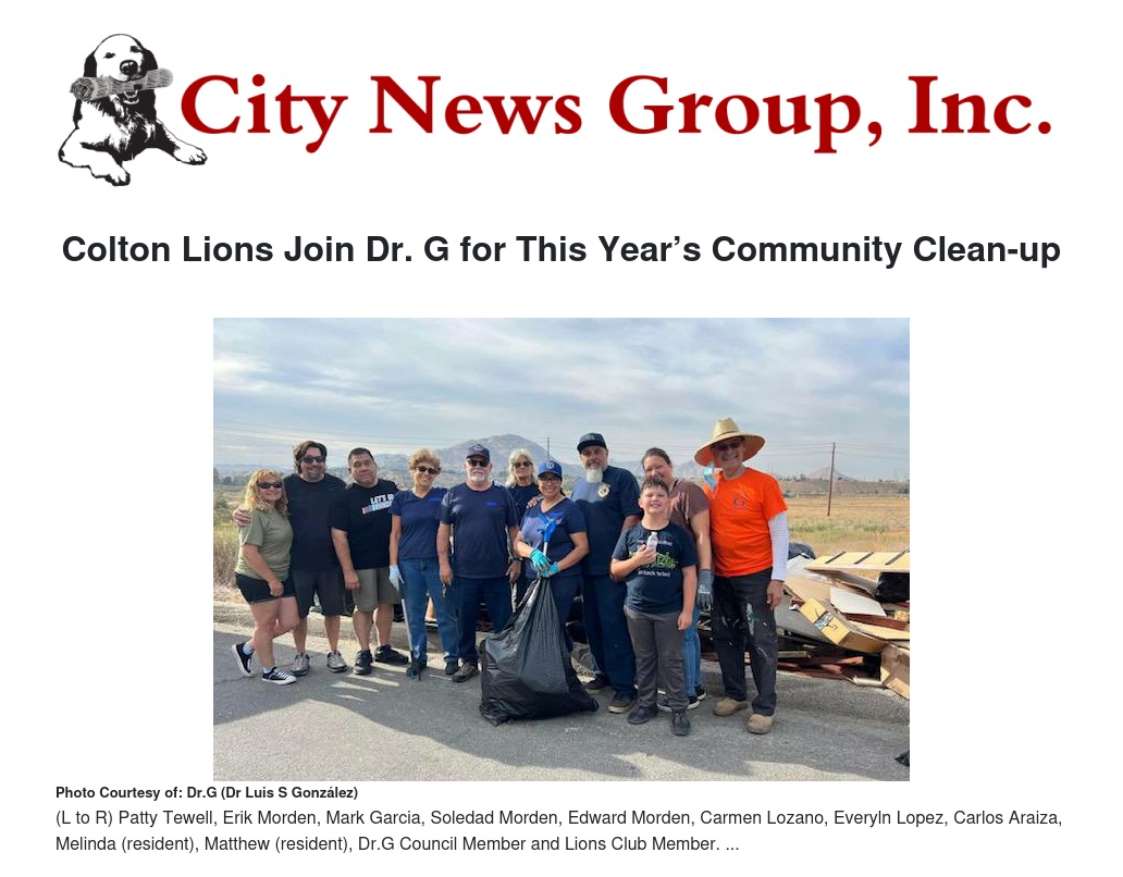 With his trash clean-up program already in place, the Lions Club’s community service goal is a good fit, and with their available manpower, large clean-up projects are possible. According to President Cynthia Calderilla, “Our motto is to serve, and we engage in projects that help the community.” Established in 2019, the Colton Lions Club is often seen at community events and often provides individuals with food, clothes, gift cards, eyeglasses, and backpacks.