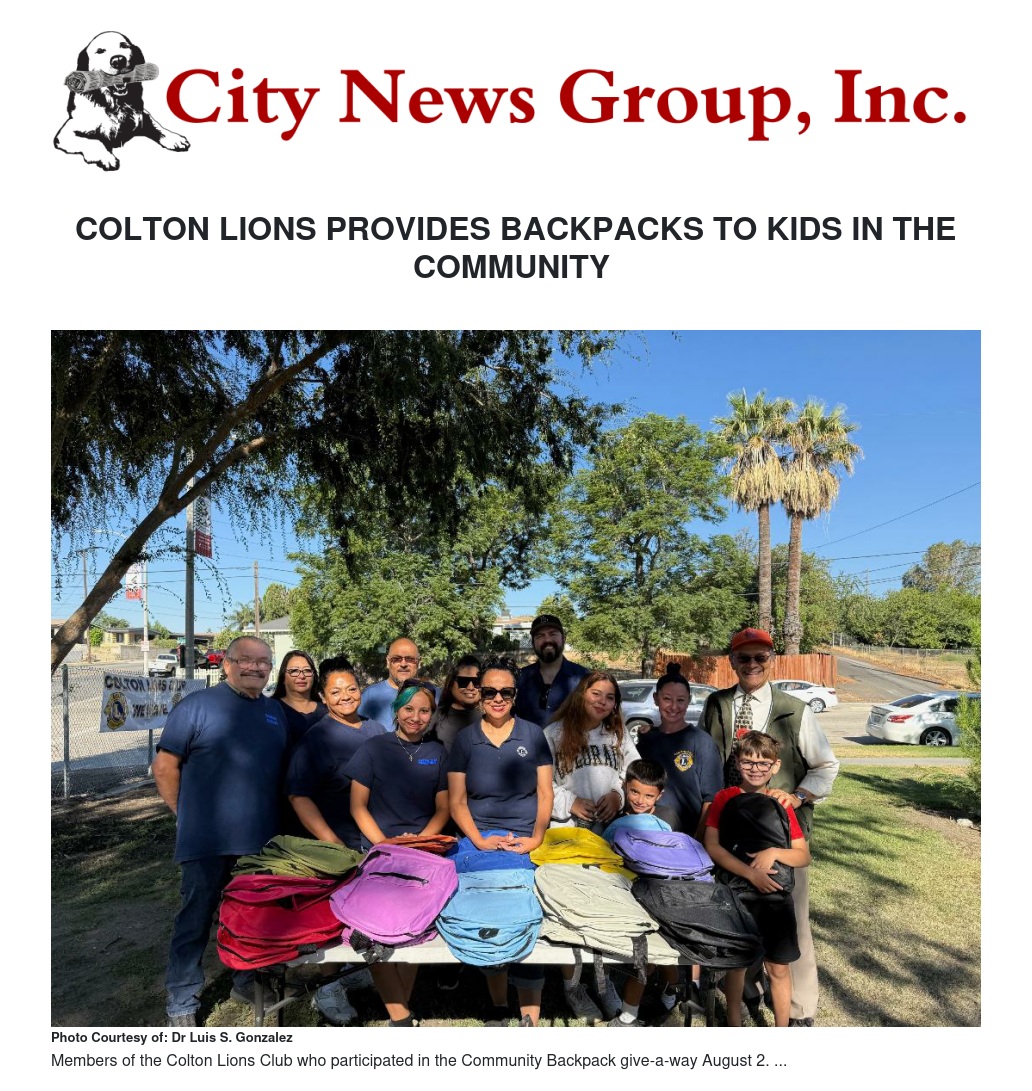 “We believe in helping the community,” says Evelyn Lopez, one of the long-time members, who went on to explain, “The funds came from Forest Financial Insurance Co, who offer grants for local community efforts.” One of the members of the Colton Lions, Debbie Walker, devoted several hours to research grant opportunities and worked to write and secure this community grant which brought forth the funds within six weeks. “Once received,” responded Debbie when asked, “We set out to contact Amazon to purchase the backpacks.”